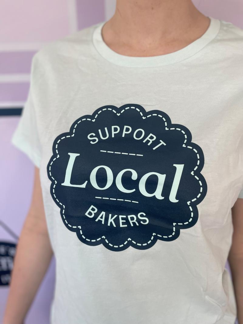 The powerful message, 'Support Local Bakers,' reflects the spirit of bakesale's community, where we come together to uplift our talented local bakers. By wearing this tee, you're not only expressing your passion for baking but also spreading the message of supporting those who bake with love.